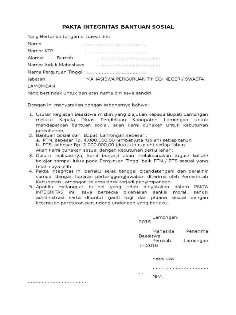 Universitas demikian pakta integritas ini dibuat agar dapat dipergunakan sebagaimana mestinya. Contoh surat pernyataan pakta integritas bermaterai serotoh. Mahasiswa dijamin untuk tidak terlibat dalam politik praktis yang mengganggu tatanan akademik dan bernegara. Isu pakta integritas ini cukup membuat resah komponen sivitas akademika ui. Mahasiswa diminta menandatangani pakta integritas itu di atas materai secara sadar dan tanpa paksaan.