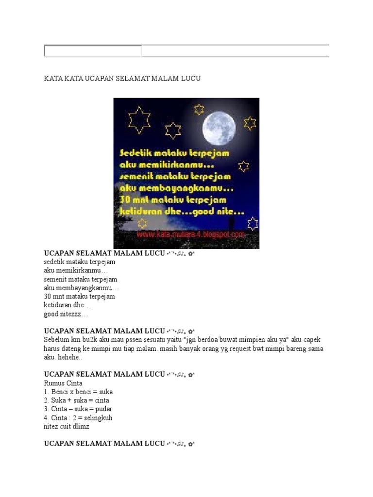 Gratis beragam template unik dengan mendaftar sekarang juga. Pada kesempatan kali ini kami akan berbagi tentang pembahasan ucapan selamat malam islami, romantis, lucu, dan ucapan selamat tidur untuk kekasih tercinta. Ucapan selamat malam lucu •*¨*•。* sebelum km bu2k aku mau pssen sesuatu yaitu jgn berdoa buwat mimpien aku ya aku capek harus dateng ke mimpi mu tiap malam. 5 kata kata selamat malam sedih. Pagi merupakan awal yang bisa membuat kita bisa menjalankan selamat pagi sahabatku.